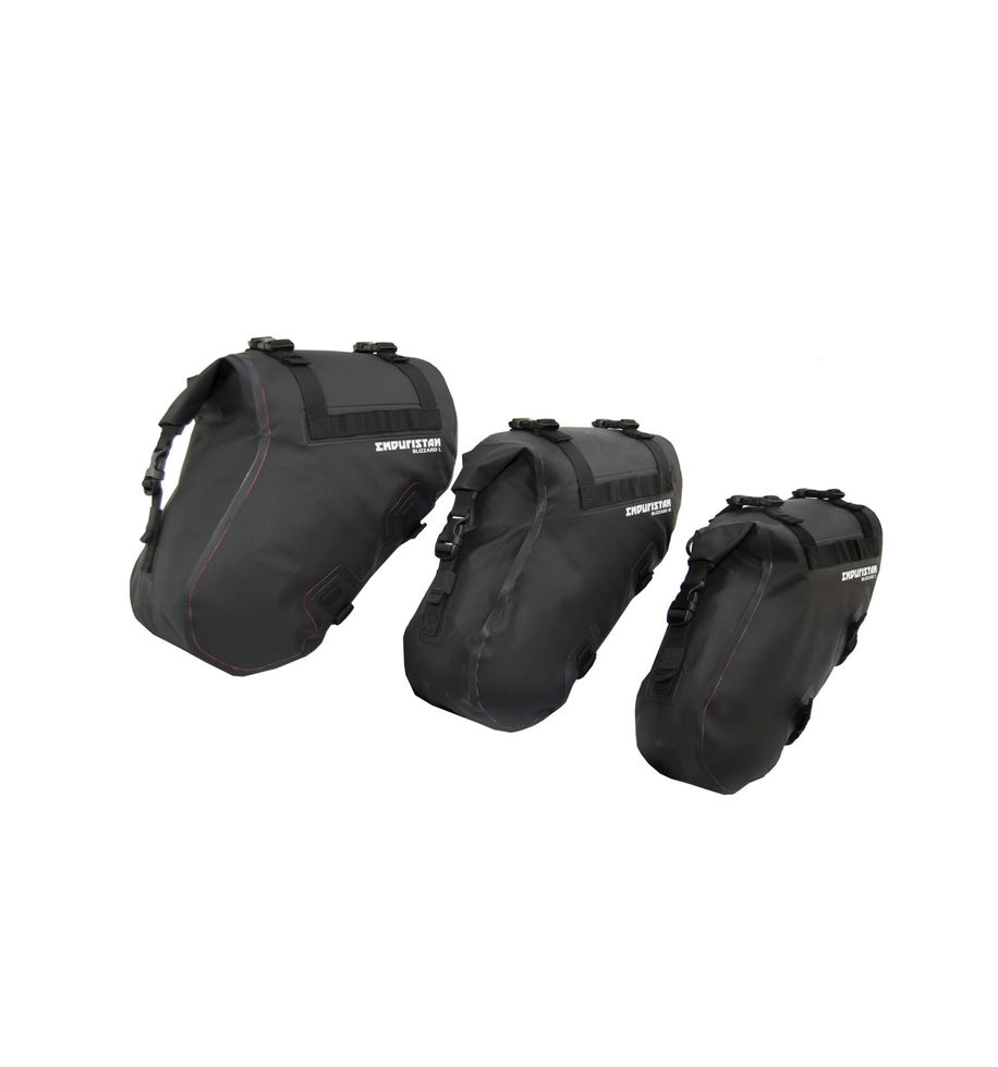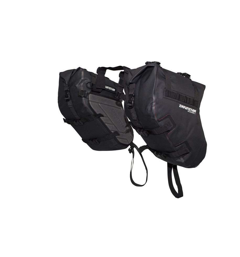 בחלק התחתון של תיקי האוכף, ניתן להמיר בקלות את שתי רצועות הדחיסה לנקודת חיבור להרכבת מחזיקי בקבוקי דלק או תיק מגן (תקף למידה M או L, לא S). זה מאפשר לך להוסיף 2 x 1.5 ליטר של נפח אחסון נוסף, 2 x 1 ליטר דלק או שילוב של שניהם. בחלק העליון של התיקים יש מקום לחיבור שני מחזיקי בקבוקי דלק נוספים כדי להגדיל את טווח הנסיעה שלכם למקסימום. החלק העליון של האופנוע נשאר פנוי לחיבור, למשל, תיק Tornado 2. אם אתם מתכננים לרכוב קשה, תוכלו לבחור ב-Rally Pack או באחד מתיקי הבסיס של Enduristan כדי לא להגביל את חופש התנועה שלכם יותר מדי.